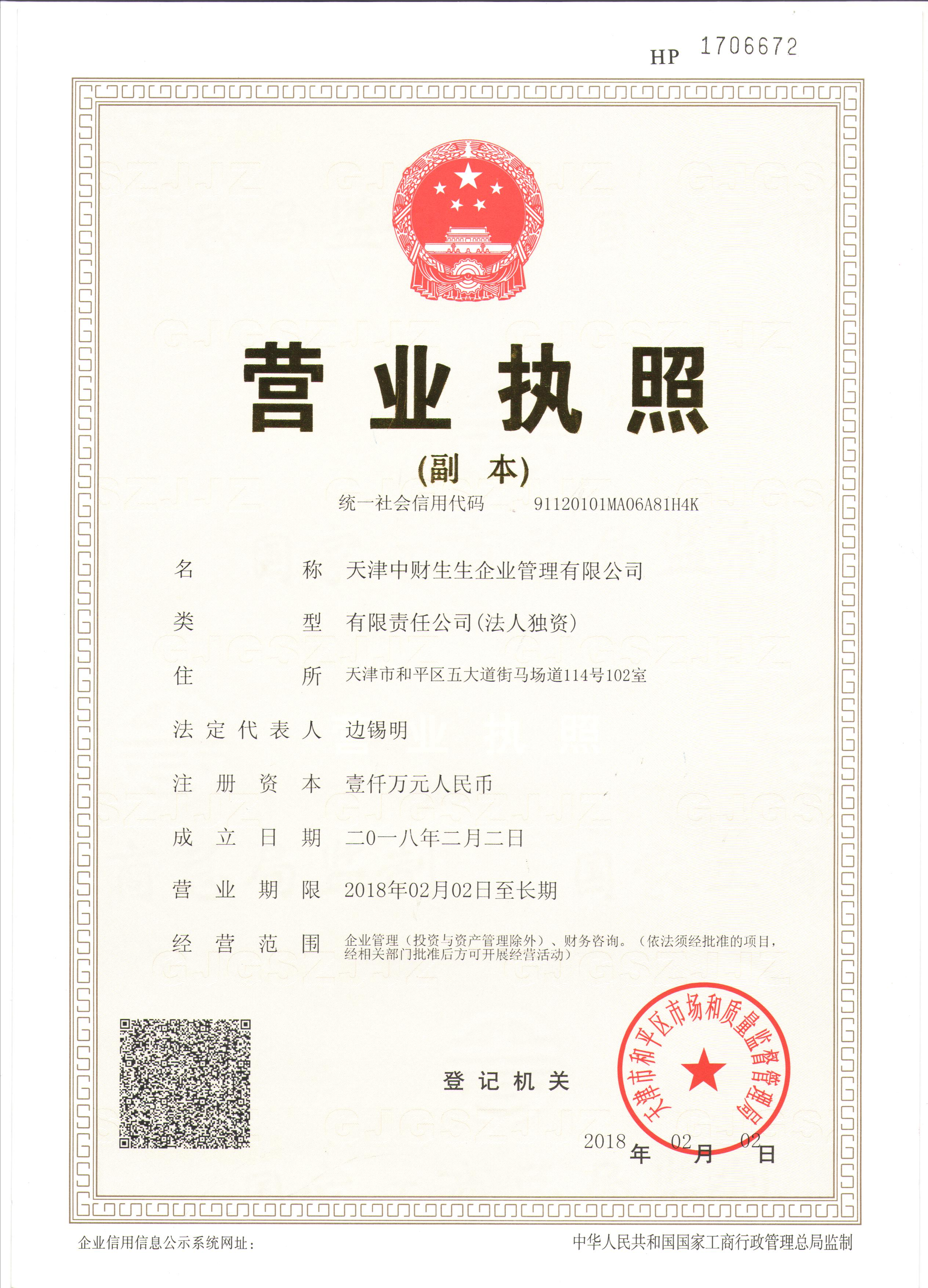 中財訊 在集團領導的大力支持和相關部門的通力配合下,中財生生資本之一線機構天津中財生生企業管理有限公司正式領取營業執照。